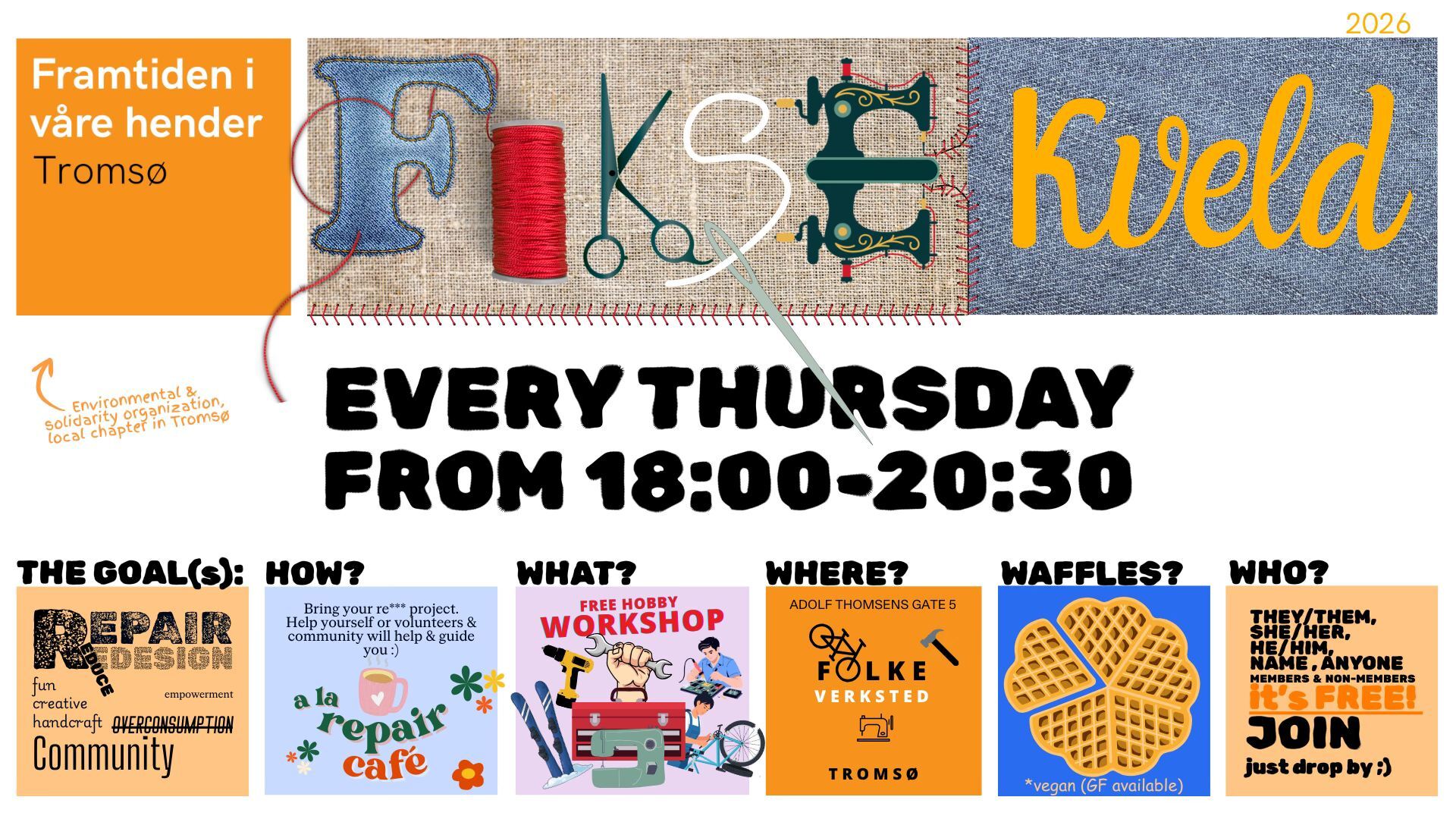 Fiksekveld is a hobby workshop and community for repairs, mending, redesign, waffles*, and discussions. Completely free of charge. We have lots of tools; see the full list below. The concept is DIY, but you will get loads of help from us volunteers or other friendly people. There will be waffles and tea/coffee, and a cozy atmosphere. So, whether you lack tools, motivation, inspiration, or just like waffles and community, you are very welcome! Here you can also chat with the local team if you want to know more.