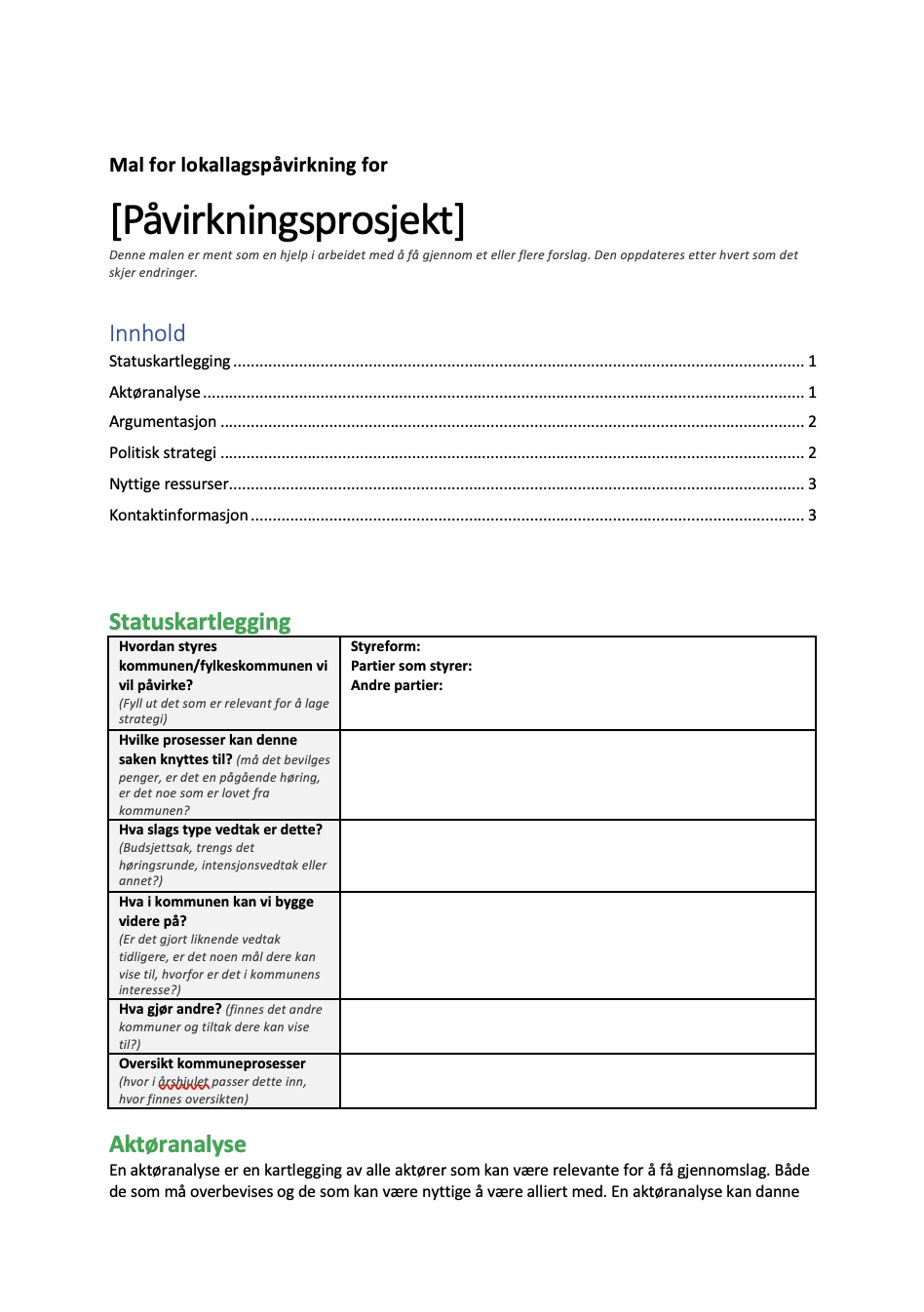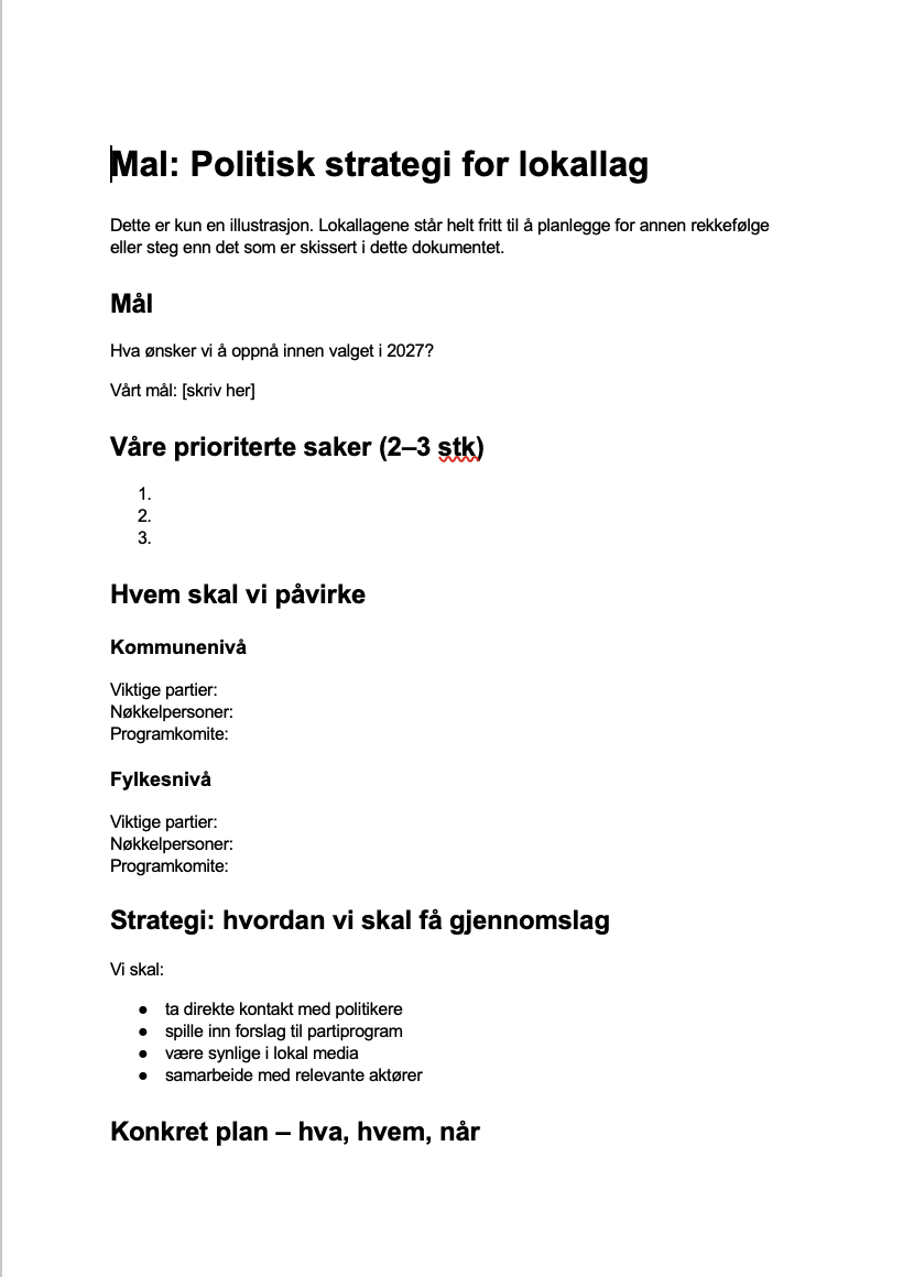 Nederst finner du vår mal for lokallagspåvirkning som kan hjelpe dere med å utforme den politiske strategien. Hensikten er ikke å gi lokallaget mye ekstraarbeid, så fyll kun ut det som er nyttig for arbeidet deres. Malen tar for seg statuskartlegging, aktøranalyse, argumentasjon og utformingen av strategi for å få til vedtak.