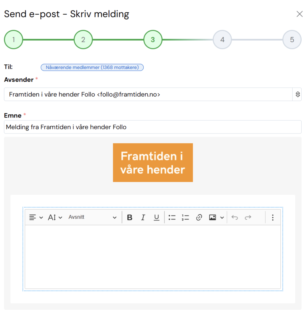 Klikk på @-ikonet på «nåværende medlemmer». Da sender du til alle medlemmene som er tilknyttet lokallaget. Da havner du her: