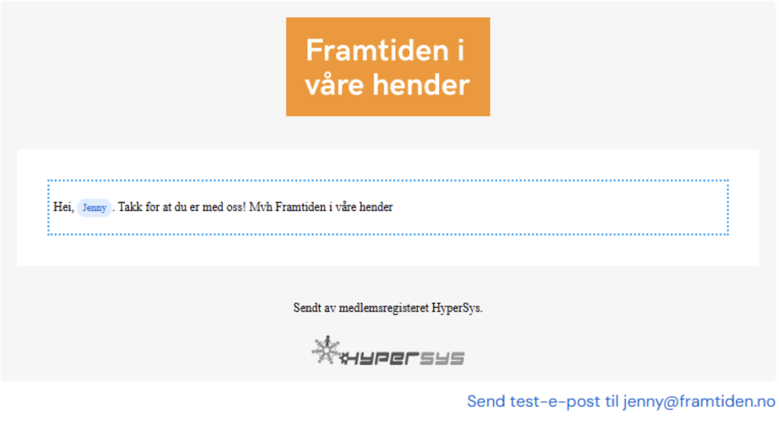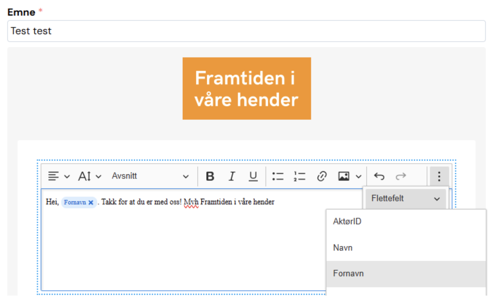 - Bruk flettefelt (til høyre i verktøylinjen): e-postene kan gjøres mer personlig, for eksempel med fornavn og medlemsnummer. Feltene som brukes henter informasjonen vi har lagret i Hypersys på mottaker. Dette reduserer i tillegg sannsynligheten for at e-posten oppfattes som spam.